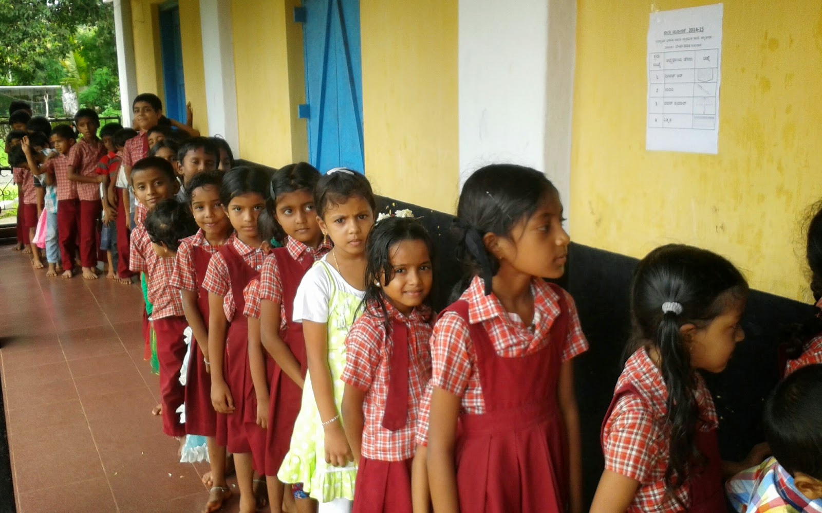 ಸಾಲಿನಲ್ಲಿ ನಿಂತ ಶಾಲಾ ವಿದ್ಯಾರ್ಥಿಗಳು